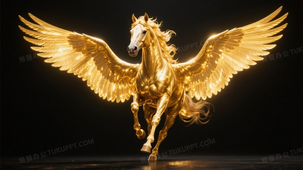 本作品内容为画面中间是一匹浑身发光的长着巨大金色翅膀的天使一样的金色骏马, 格式为 jpg, 大小1 MB, 图片尺寸为1664 x 936, 作品中背景图片无需修改, 源文件无水印,可以直接使用, 欢迎使用熊猫办公。 如认为平台内容涉嫌侵权,可通过邮件:tousu@tukuppt.com提出书面通知,我们将及时处理。