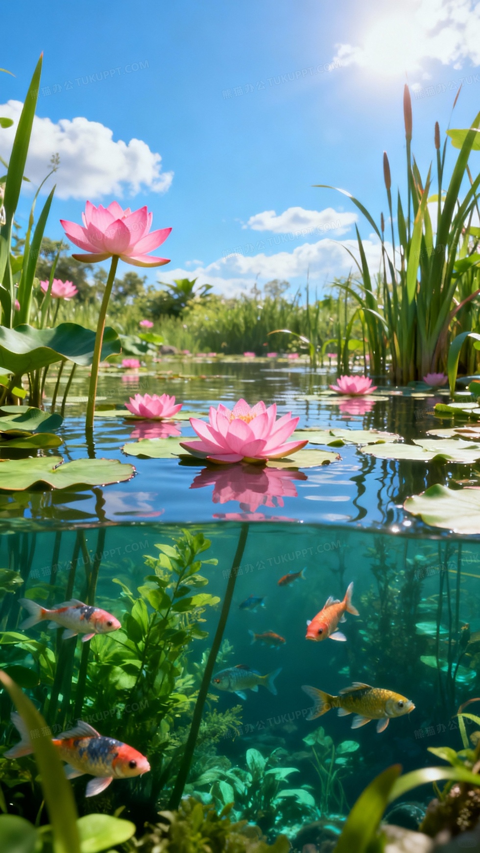 本作品内容为蓝天白云和阳光照在池塘下清水中漂浮的粉色荷花上, 格式为 jpg, 大小1 MB, 图片尺寸为1440 x 2560, 源文件无水印, 欢迎使用熊猫办公。 如认为平台内容涉嫌侵权,可通过邮件:tousu@tukuppt.com提出书面通知,我们将及时处理。