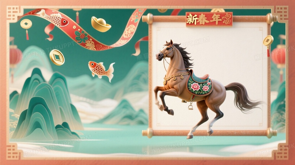 本作品内容为新春贺岁背景设计矫健的蒙古马完整的出现在图片中左侧或者右侧区域, 格式为 jpg, 大小1 MB, 图片尺寸为1664 x 936, 作品中背景图片无需修改, 源文件无水印,可以直接使用, 欢迎使用熊猫办公。 如认为平台内容涉嫌侵权,可通过邮件:tousu@tukuppt.com提出书面通知,我们将及时处理。