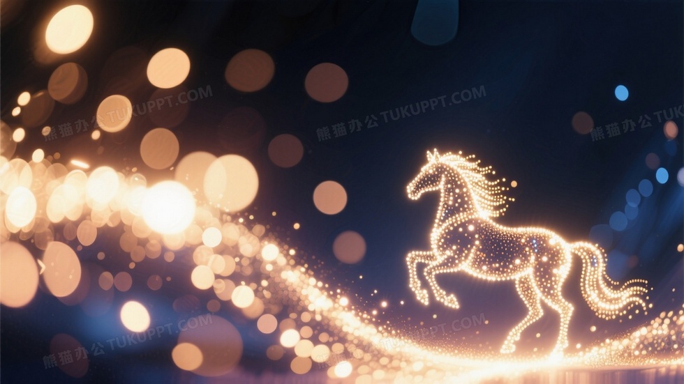 本作品内容为画面右下角是粒子光效组成的骏马形象, 格式为 jpg, 大小1 MB, 图片尺寸为1664 x 936, 作品中背景图片无需修改, 源文件无水印,可以直接使用, 欢迎使用熊猫办公。 如认为平台内容涉嫌侵权,可通过邮件:tousu@tukuppt.com提出书面通知,我们将及时处理。
