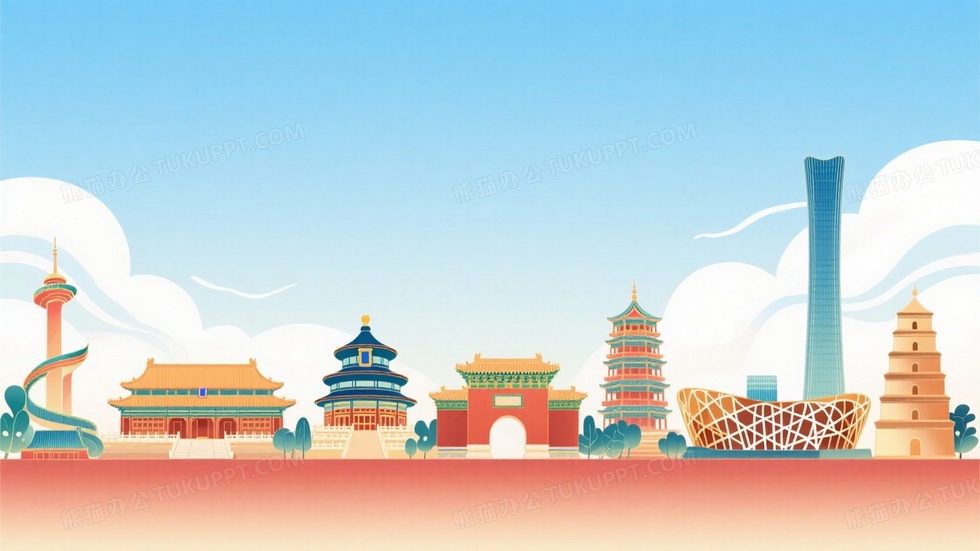 本作品内容为北京地标插画所有元素在一排出现在画面靠下, 格式为 jpg, 大小1 MB, 图片尺寸为1664 x 936, 作品中背景图片无需修改, 源文件无水印,可以直接使用, 欢迎使用熊猫办公。 如认为平台内容涉嫌侵权,可通过邮件:tousu@tukuppt.com提出书面通知,我们将及时处理。