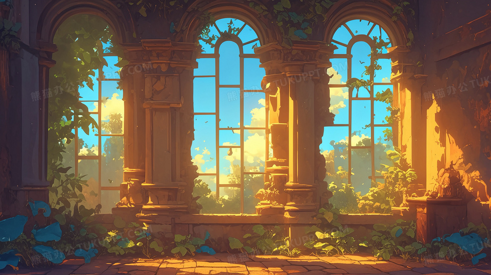 本作品内容为破旧建筑内景植物欧式窗户插画, 格式为 jpg, 大小3 MB, 图片尺寸为2912 x 1632, 源文件无水印, 欢迎使用熊猫办公。 如认为平台内容涉嫌侵权,可通过邮件:tousu@tukuppt.com提出书面通知,我们将及时处理。