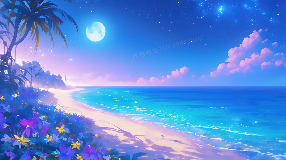 本作品内容为唯美紫色大海花丛星空蓝天白云大自然风景插画, 格式为 jpg, 大小3 MB, 图片尺寸为2912 x 1632, 源文件无水印, 欢迎使用熊猫办公。 如认为平台内容涉嫌侵权,可通过邮件:tousu@tukuppt.com提出书面通知,我们将及时处理。