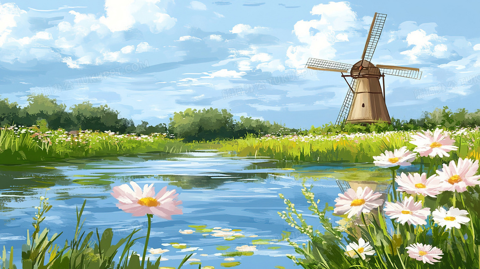 首页 > 插画 > 科技艺术 > 水彩手绘 > 春天户外花海中的风车建筑物插画