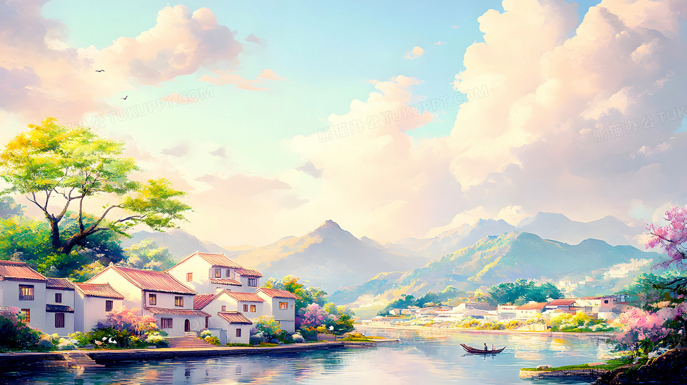 本作品内容为插画风格江南水乡唯美春天风光山峰小河特色建筑, 格式为 jpg, 大小4 MB, 图片尺寸为2912 x 1632, 源文件无水印, 欢迎使用熊猫办公。 如认为平台内容涉嫌侵权,可通过邮件:tousu@tukuppt.com提出书面通知,我们将及时处理。