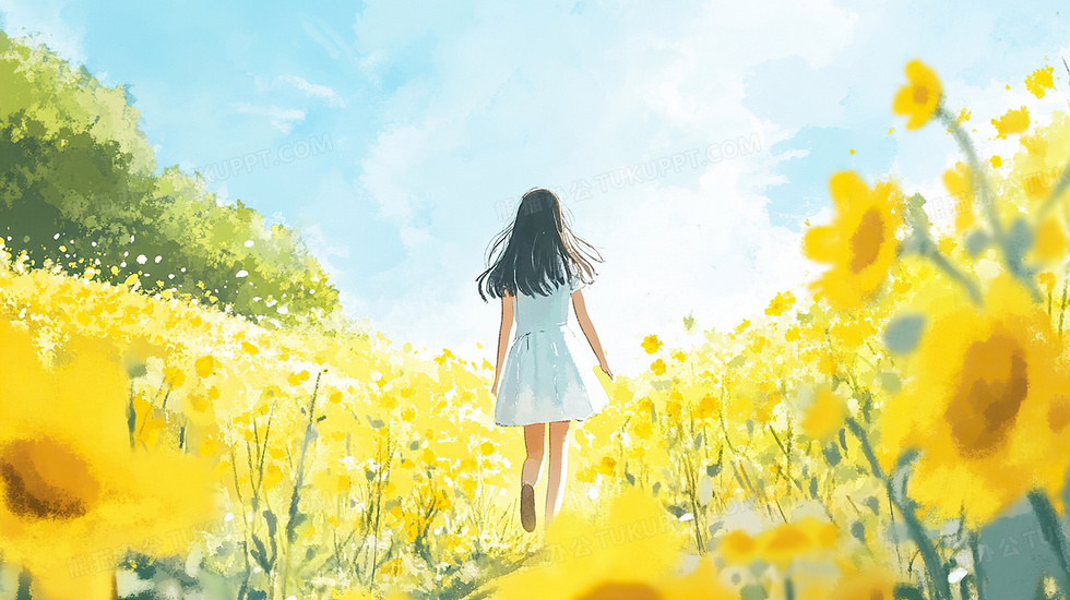 本作品内容为向日葵田野中的漫步女孩水彩风插画, 格式为 jpg, 大小3 MB, 图片尺寸为2912 x 1632, 源文件无水印, 欢迎使用熊猫办公。 如认为平台内容涉嫌侵权,可通过邮件:tousu@tukuppt.com提出书面通知,我们将及时处理。
