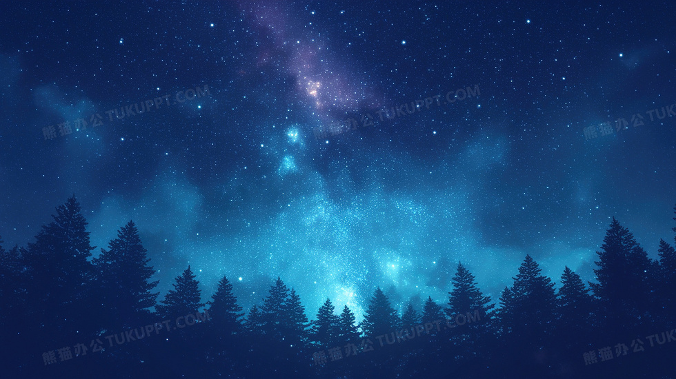 本作品内容为蓝色森林星空风景背景, 格式为 jpg, 大小3 MB, 图片尺寸为2912 x 1632, 作品中背景图片无需修改, 源文件无水印,可以直接使用, 欢迎使用熊猫办公。 如认为平台内容涉嫌侵权,可通过邮件:tousu@tukuppt.com提出书面通知,我们将及时处理。