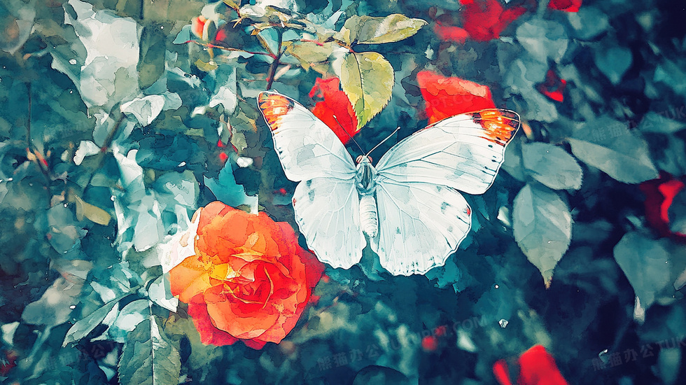 本作品内容为水彩花卉停留在红色玫瑰花上的蝴蝶插画, 格式为 jpg, 大小4 MB, 图片尺寸为2912 x 1632, 源文件无水印, 欢迎使用熊猫办公。 如认为平台内容涉嫌侵权,可通过邮件:tousu@tukuppt.com提出书面通知,我们将及时处理。