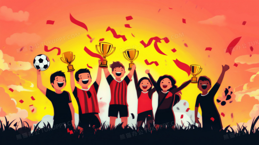 本作品内容为足球运动足球队胜利欢呼庆祝插画, 格式为 jpg, 大小5 MB, 图片尺寸为2912 x 1632, 源文件无水印, 欢迎使用熊猫办公。 如认为平台内容涉嫌侵权,可通过邮件:tousu@tukuppt.com提出书面通知,我们将及时处理。