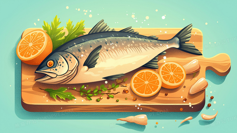 首页 > 插画 > 科技艺术 > 卡通漫画 > 生鲜美食罗非鱼水果橙子卡通插画