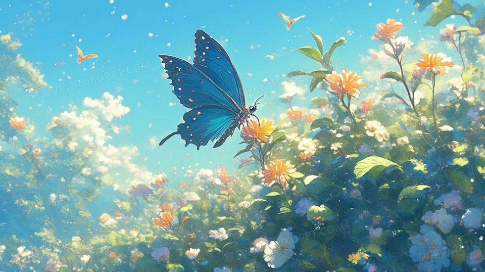 本作品内容为蓝色的蝴蝶在花丛间飞舞插画, 格式为 jpg, 大小1 MB, 图片尺寸为2285 x 1281, 源文件无水印, 欢迎使用熊猫办公。 如认为平台内容涉嫌侵权,可通过邮件:tousu@tukuppt.com提出书面通知,我们将及时处理。