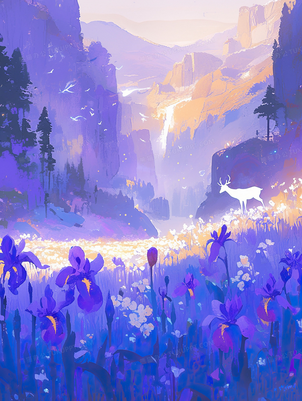 本作品内容为灵犀鸢尾幻境唯美风景插画, 格式为 jpg, 大小3 MB, 图片尺寸为1856 x 2464, 源文件无水印, 欢迎使用熊猫办公。 如认为平台内容涉嫌侵权,可通过邮件:tousu@tukuppt.com提出书面通知,我们将及时处理。