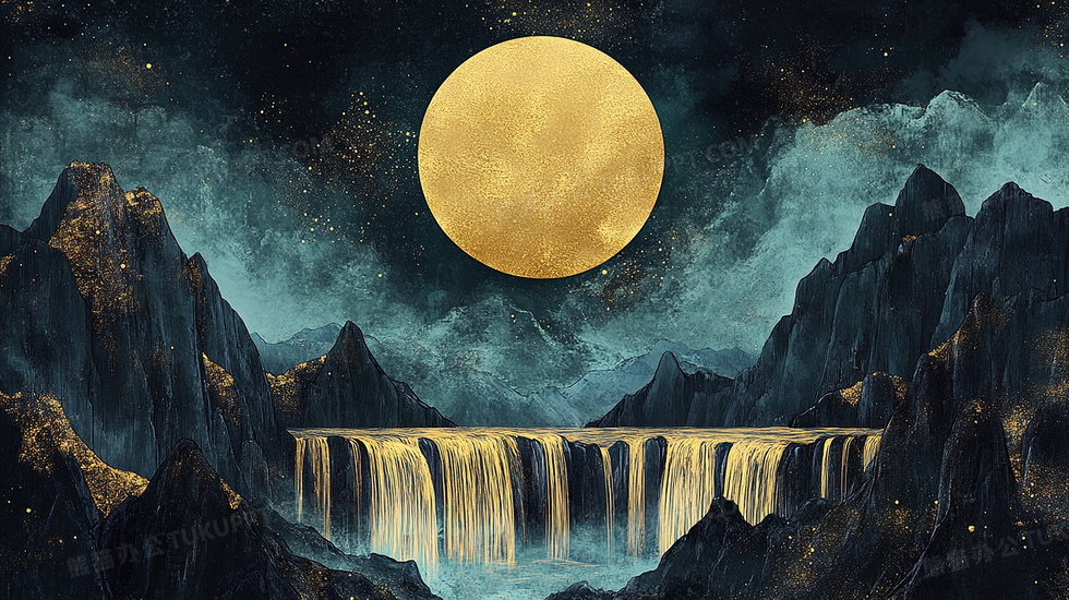 本作品内容为蓝色瀑布烫金中国风山水插画, 格式为 jpg, 大小5 MB, 图片尺寸为2912 x 1632, 源文件无水印, 欢迎使用熊猫办公。 如认为平台内容涉嫌侵权,可通过邮件:tousu@tukuppt.com提出书面通知,我们将及时处理。