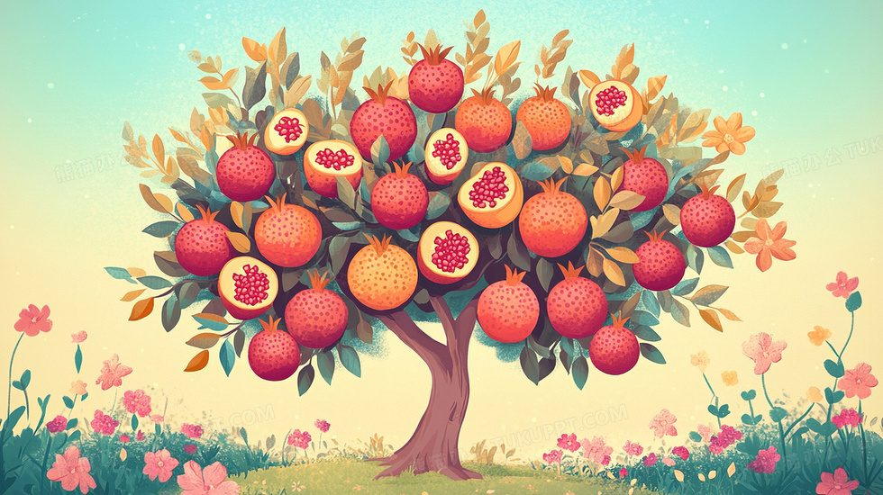 本作品内容为红石榴诱人新鲜水果树插画, 格式为 jpg, 大小4 MB, 图片尺寸为2912 x 1632, 源文件无水印, 欢迎使用熊猫办公。 如认为平台内容涉嫌侵权,可通过邮件:tousu@tukuppt.com提出书面通知,我们将及时处理。