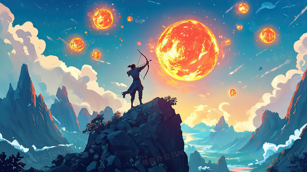 本作品内容为后羿射日成语插画, 格式为 jpg, 大小4 MB, 图片尺寸为2912 x 1632, 源文件无水印, 欢迎使用熊猫办公。 如认为平台内容涉嫌侵权,可通过邮件:tousu@tukuppt.com提出书面通知,我们将及时处理。