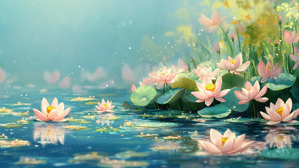 本作品内容为夏天户外美丽的荷花池插画, 格式为 jpg, 大小3 MB, 图片尺寸为2912 x 1632, 源文件无水印, 欢迎使用熊猫办公。 如认为平台内容涉嫌侵权,可通过邮件:tousu@tukuppt.com提出书面通知,我们将及时处理。