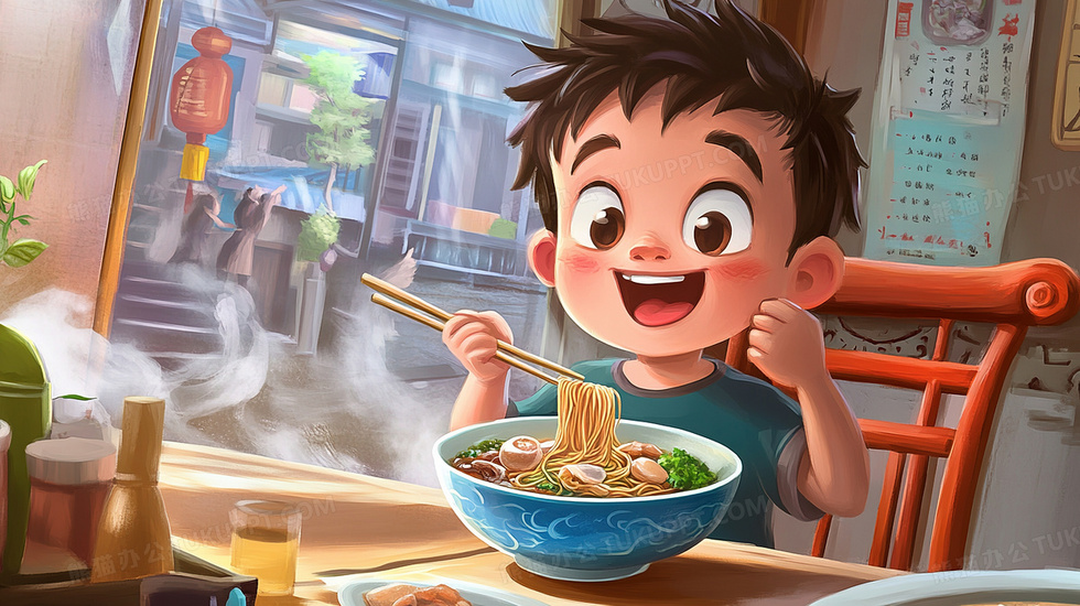 首页 > 插画 > 科技艺术 > 卡通漫画 > 二月二龙抬头风俗吃龙须面的卡通男孩插画