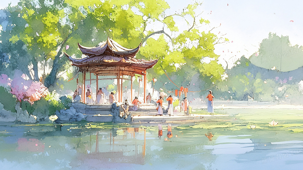 本作品内容为中式建筑亭子古代人物湖边景色插画, 格式为 jpg, 大小3 MB, 图片尺寸为2912 x 1632, 源文件无水印, 欢迎使用熊猫办公。 如认为平台内容涉嫌侵权,可通过邮件:tousu@tukuppt.com提出书面通知,我们将及时处理。