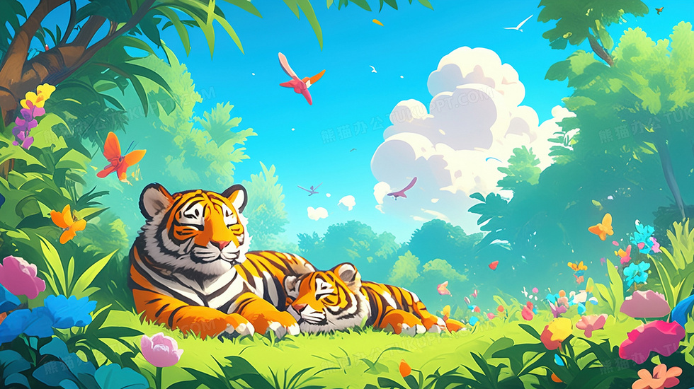 本作品内容为坐在树林草地上的两只可爱老虎插画, 格式为 jpg, 大小3 MB, 图片尺寸为2912 x 1632, 源文件无水印, 欢迎使用熊猫办公。 如认为平台内容涉嫌侵权,可通过邮件:tousu@tukuppt.com提出书面通知,我们将及时处理。