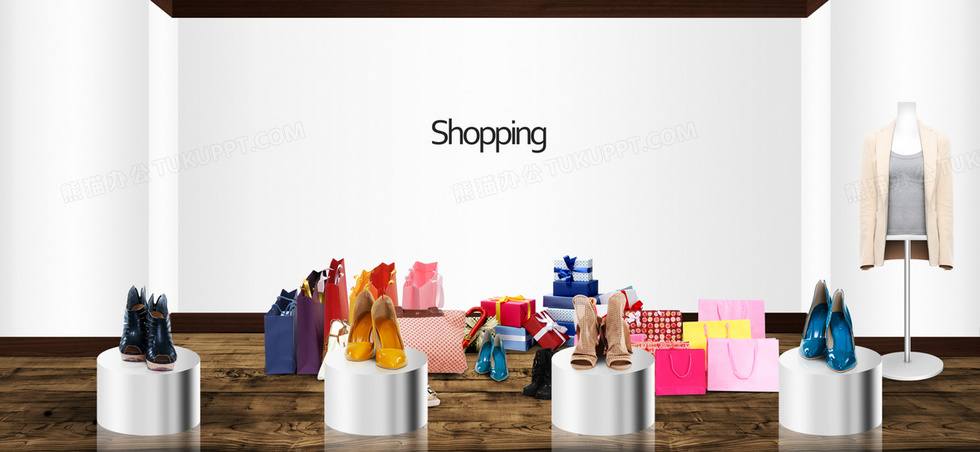本作品内容为白色墙壁礼物购物袋皮鞋女鞋女装西服展台专柜购物消费背景, 格式为 psd, 图片尺寸为1920 x 887, 作品中背景图片无需修改, 源文件无水印,可以直接使用, 欢迎使用熊猫办公。 如认为平台内容涉嫌侵权,可通过邮件:tousu@tukuppt.com提出书面通知,我们将及时处理。
