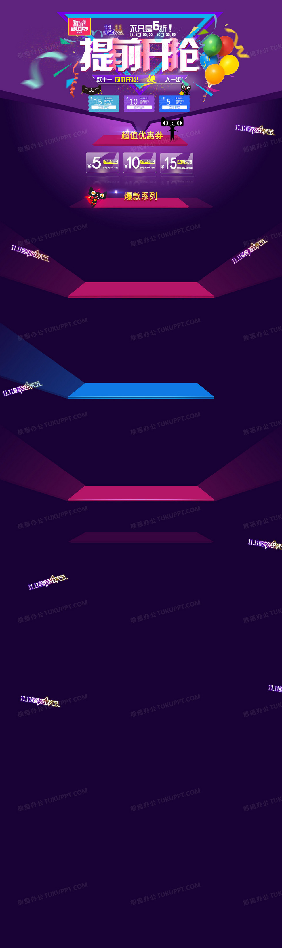 本作品内容为双十一首页背景模板, 格式为 psd, 图片尺寸为1920 x 6446, 作品中背景图片无需修改, 源文件无水印,可以直接使用, 欢迎使用熊猫办公。 如认为平台内容涉嫌侵权,可通过邮件:tousu@tukuppt.com提出书面通知,我们将及时处理。