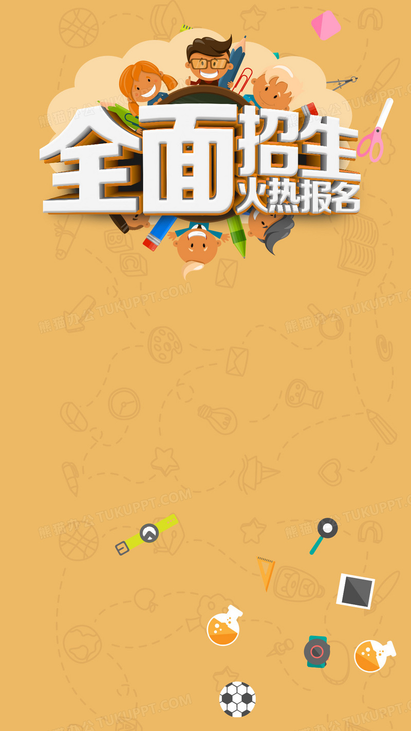 本作品内容为黄色卡通招生培训PSD分层H5背景素材, 格式为 psd, 图片尺寸为1080 x 1920, 作品中背景图片无需修改, 源文件无水印,可以直接使用, 欢迎使用熊猫办公。 如认为平台内容涉嫌侵权,可通过邮件:tousu@tukuppt.com提出书面通知,我们将及时处理。