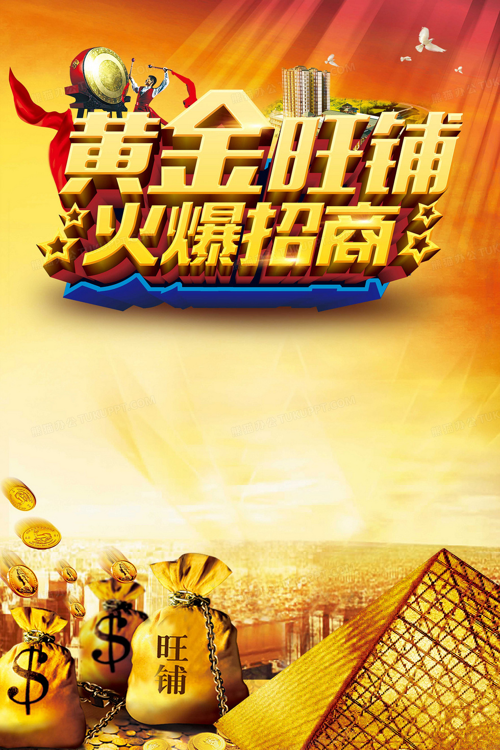 本作品内容为黄金旺铺火爆招商海报背景, 格式为 jpg, 图片尺寸为3543 x 5315, 作品中背景图片无需修改, 源文件无水印,可以直接使用, 欢迎使用熊猫办公。 如认为平台内容涉嫌侵权,可通过邮件:tousu@tukuppt.com提出书面通知,我们将及时处理。