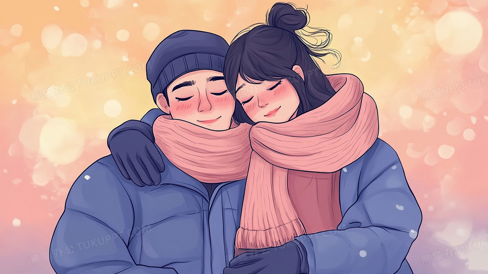 本作品内容为雪天冬天穿着厚重羽绒服相拥拥抱情侣人物插画, 格式为 jpg, 大小2 MB, 图片尺寸为2912 x 1632, 源文件无水印, 欢迎使用熊猫办公。 如认为平台内容涉嫌侵权,可通过邮件:tousu@tukuppt.com提出书面通知,我们将及时处理。