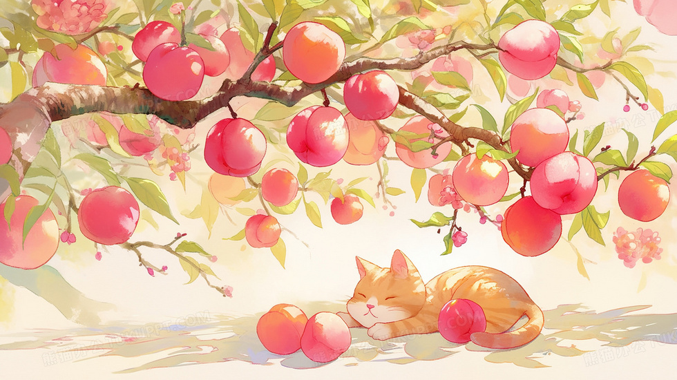 本作品内容为桃树上硕果累累的水果桃子和宠物猫插画, 格式为 jpg, 大小3 MB, 图片尺寸为2912 x 1632, 源文件无水印, 欢迎使用熊猫办公。 如认为平台内容涉嫌侵权,可通过邮件:tousu@tukuppt.com提出书面通知,我们将及时处理。