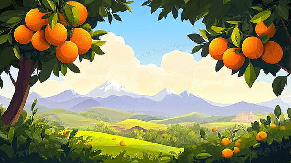 本作品内容为橘子果树诱人新鲜水果插画, 格式为 jpg, 大小3 MB, 图片尺寸为2912 x 1632, 源文件无水印, 欢迎使用熊猫办公。 如认为平台内容涉嫌侵权,可通过邮件:tousu@tukuppt.com提出书面通知,我们将及时处理。