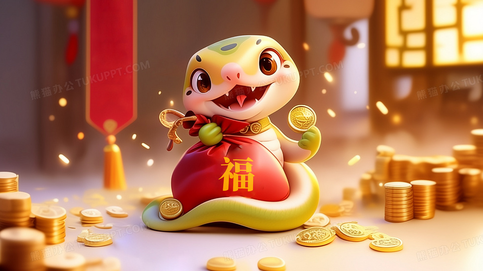 本作品内容为一条坐在红色福袋上的卡通蛇插画, 格式为 jpg, 大小5 MB, 图片尺寸为2912 x 1632, 源文件无水印, 欢迎使用熊猫办公。 如认为平台内容涉嫌侵权,可通过邮件:tousu@tukuppt.com提出书面通知,我们将及时处理。