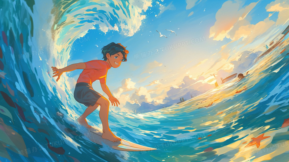 本作品内容为夏日海上冲浪卡通少年插画, 格式为 jpg, 大小3 MB, 图片尺寸为2912 x 1632, 源文件无水印, 欢迎使用熊猫办公。 如认为平台内容涉嫌侵权,可通过邮件:tousu@tukuppt.com提出书面通知,我们将及时处理。