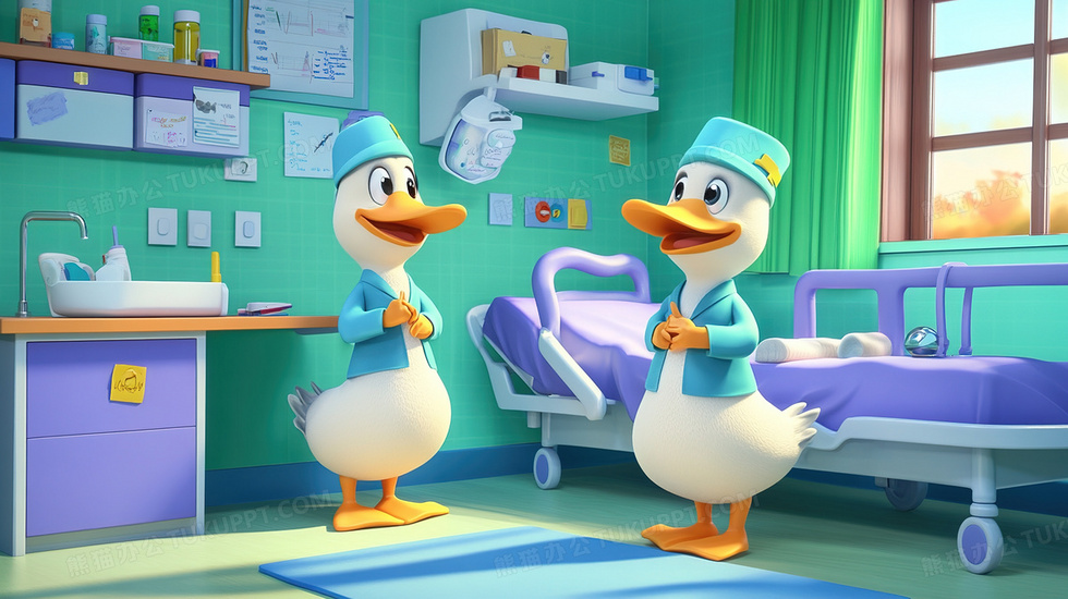 本作品内容为医院内的可爱卡通鸭子医生护士插画, 格式为 jpg, 大小3 MB, 图片尺寸为2912 x 1632, 源文件无水印, 欢迎使用熊猫办公。 如认为平台内容涉嫌侵权,可通过邮件:tousu@tukuppt.com提出书面通知,我们将及时处理。