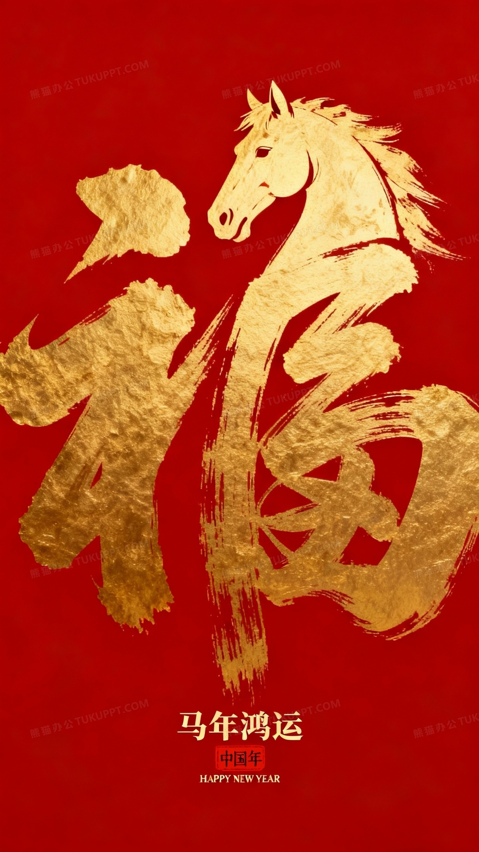 本作品内容为马年海报正红色背景抽象纯金色的马头与, 格式为 jpg, 大小1 MB, 图片尺寸为1440 x 2560, 作品中背景图片无需修改, 源文件无水印,可以直接使用, 欢迎使用熊猫办公。 如认为平台内容涉嫌侵权,可通过邮件:tousu@tukuppt.com提出书面通知,我们将及时处理。