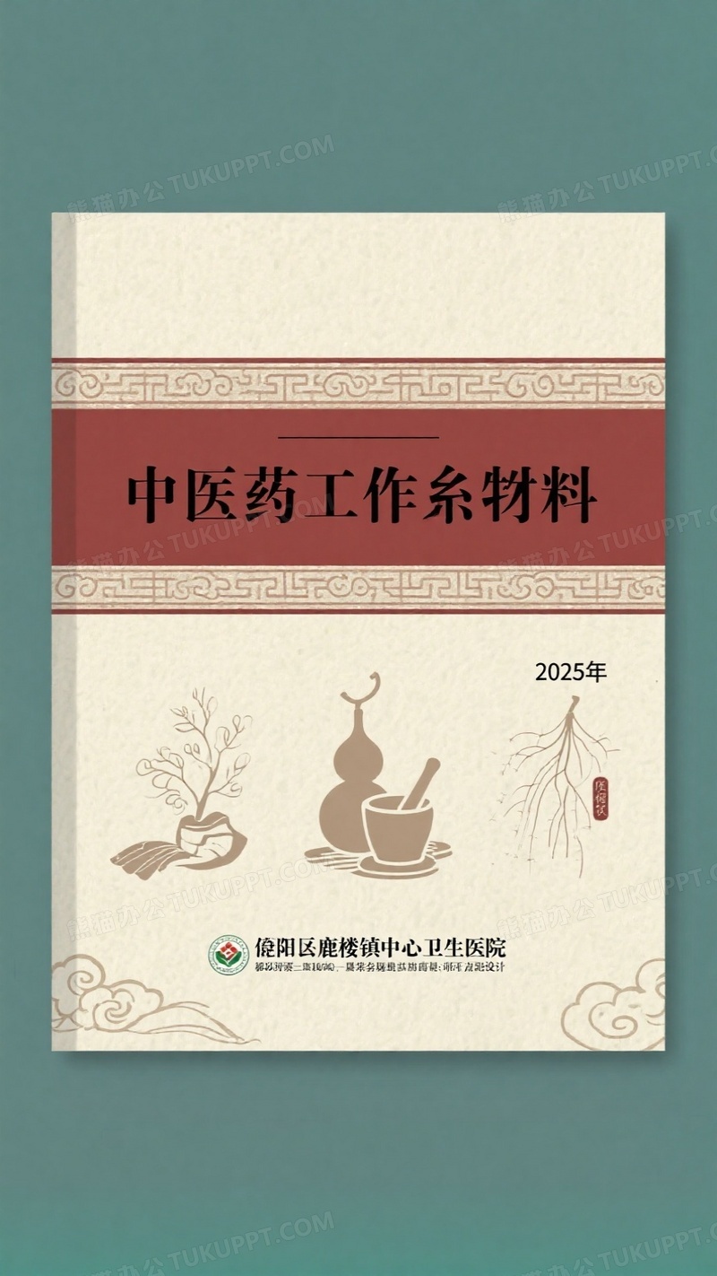 本作品内容为以下是一个中医药工作材料封皮的设计方案, 格式为 jpg, 大小1 MB, 图片尺寸为936 x 1664, 源文件无水印, 欢迎使用熊猫办公。 如认为平台内容涉嫌侵权,可通过邮件:tousu@tukuppt.com提出书面通知,我们将及时处理。