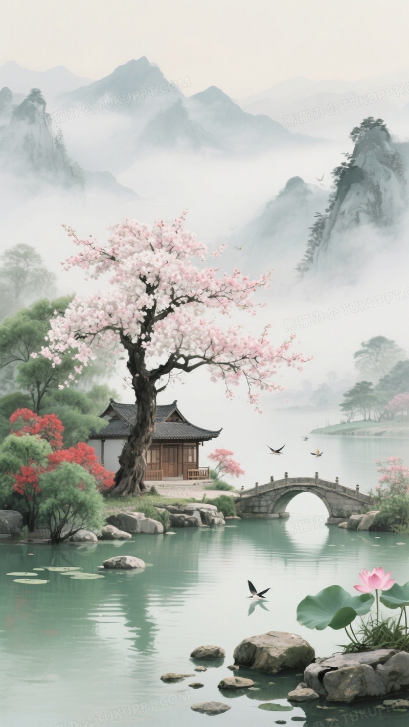 本作品内容为画面展现了一幅中式山水意境图, 格式为 jpg, 大小1 MB, 图片尺寸为936 x 1664, 源文件无水印, 欢迎使用熊猫办公。 如认为平台内容涉嫌侵权,可通过邮件:tousu@tukuppt.com提出书面通知,我们将及时处理。