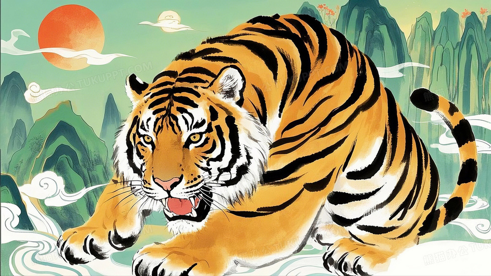 本作品内容为中国水墨风老虎场景插画, 格式为 jpg, 大小3 MB, 图片尺寸为2720 x 1530, 源文件无水印, 欢迎使用熊猫办公。 如认为平台内容涉嫌侵权,可通过邮件:tousu@tukuppt.com提出书面通知,我们将及时处理。