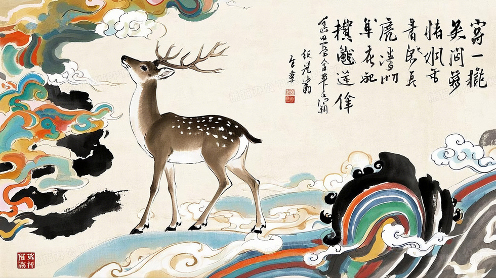 本作品内容为中国水墨风鹿场景插画, 格式为 jpg, 大小3 MB, 图片尺寸为2720 x 1530, 源文件无水印, 欢迎使用熊猫办公。 如认为平台内容涉嫌侵权,可通过邮件:tousu@tukuppt.com提出书面通知,我们将及时处理。