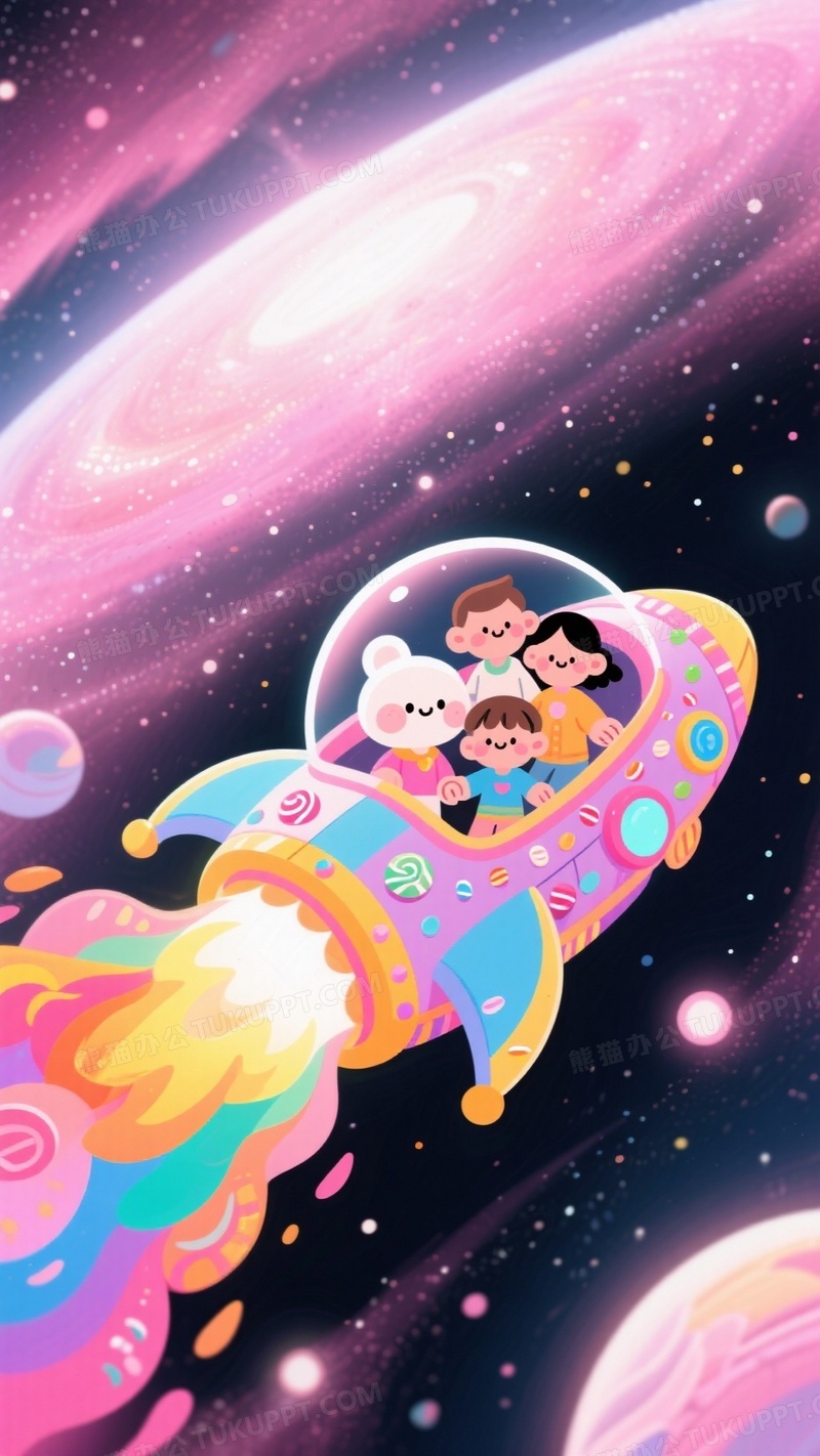 萌萌的卡通插画一家人坐在装饰着糖果色的宇宙飞船里