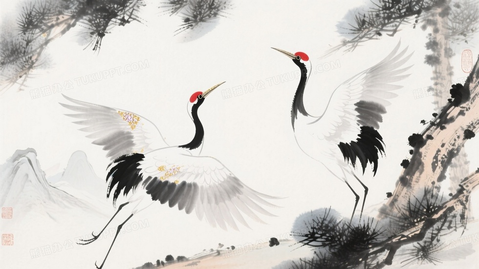 本作品内容为水墨风格仙鹤插画两只丹顶鹤在松林间展翅, 格式为 jpg, 大小1 MB, 图片尺寸为1664 x 936, 源文件无水印, 欢迎使用熊猫办公。 如认为平台内容涉嫌侵权,可通过邮件:tousu@tukuppt.com提出书面通知,我们将及时处理。