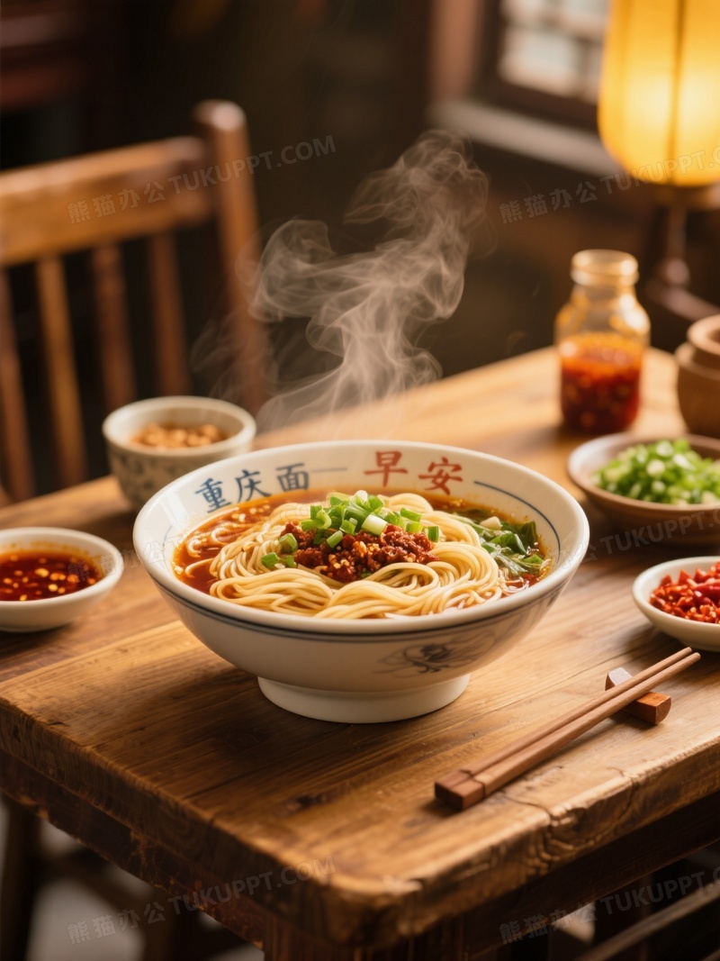 本作品内容为写实风格一碗热气腾腾的重庆小面摆在木质餐桌上, 格式为 jpg, 大小1 MB, 图片尺寸为1104 x 1472, 源文件无水印, 欢迎使用熊猫办公。 如认为平台内容涉嫌侵权,可通过邮件:tousu@tukuppt.com提出书面通知,我们将及时处理。