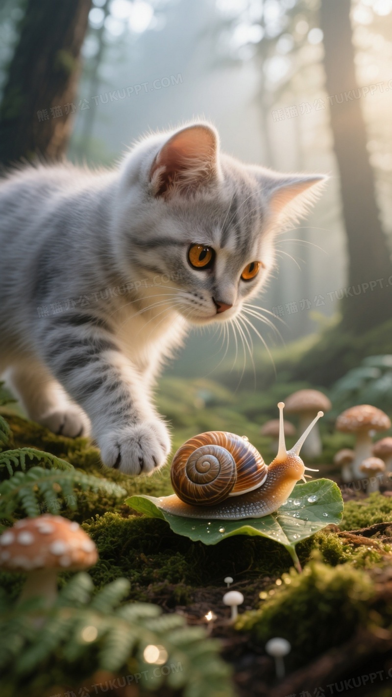 本作品内容为清晨童话森林中一只银渐层幼猫弓背凝视叶片上的琥珀纹蜗牛, 格式为 jpg, 大小1 MB, 图片尺寸为936 x 1664, 源文件无水印, 欢迎使用熊猫办公。 如认为平台内容涉嫌侵权,可通过邮件:tousu@tukuppt.com提出书面通知,我们将及时处理。