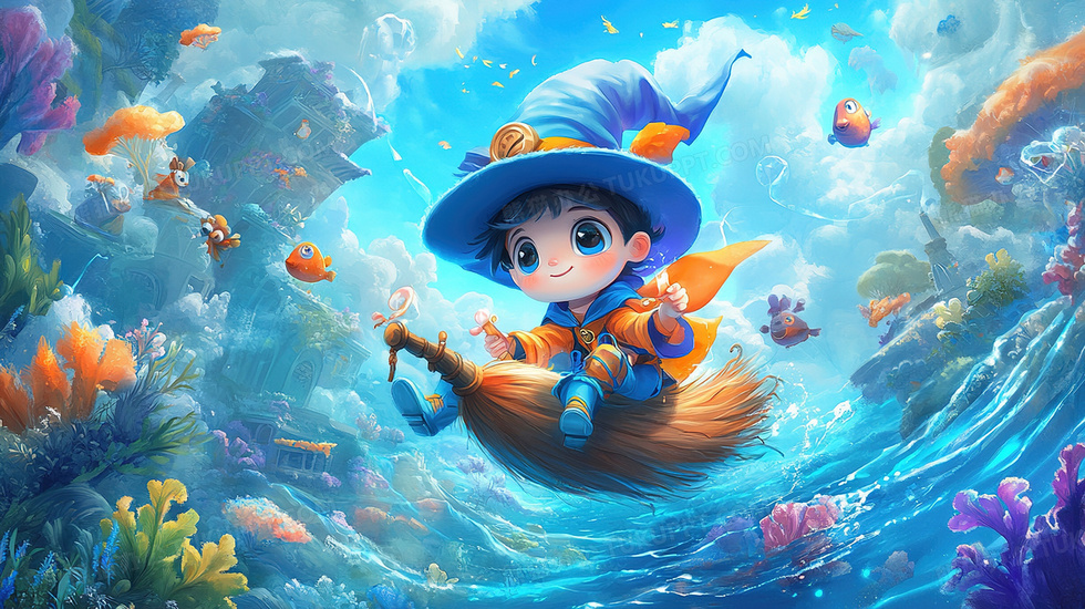 本作品内容为儿童绘本坐着扫帚飞翔卡通男孩插画, 格式为 jpg, 大小4 MB, 图片尺寸为2912 x 1632, 源文件无水印, 欢迎使用熊猫办公。 如认为平台内容涉嫌侵权,可通过邮件:tousu@tukuppt.com提出书面通知,我们将及时处理。