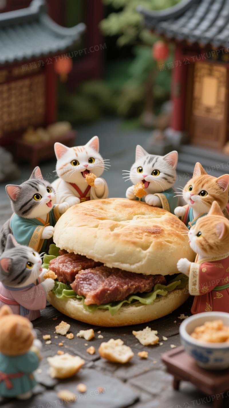 本作品内容为微缩景观下一群穿着汉服的小猫咪围坐在巨大的肉夹馍旁, 格式为 jpg, 大小1 MB, 图片尺寸为936 x 1664, 源文件无水印, 欢迎使用熊猫办公。 如认为平台内容涉嫌侵权,可通过邮件:tousu@tukuppt.com提出书面通知,我们将及时处理。