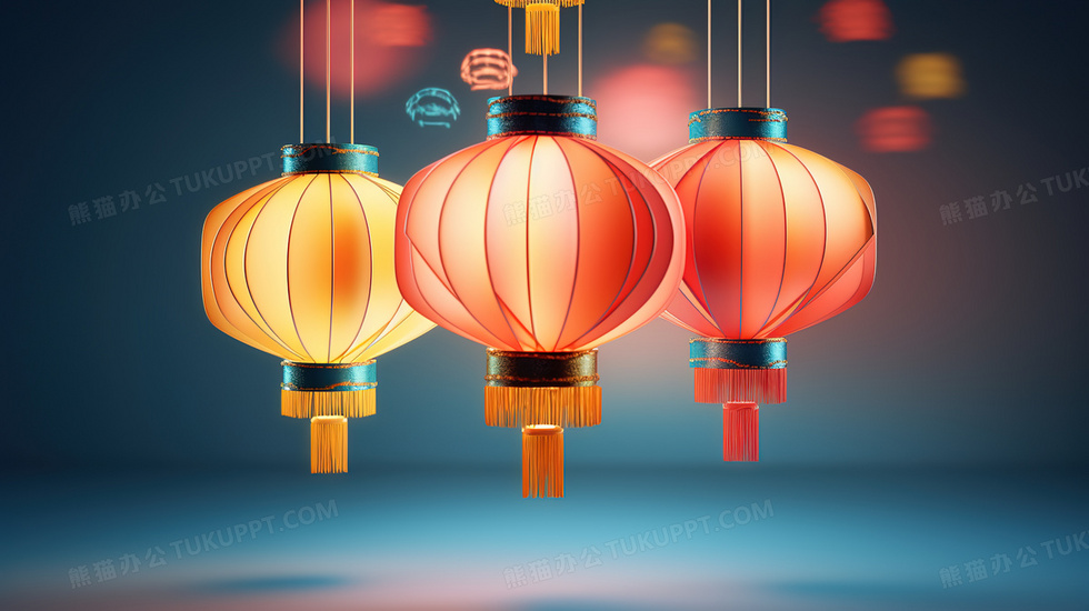 本作品内容为3D立体中国风灯笼装饰春节插画, 格式为 jpg, 大小4 MB, 图片尺寸为2912 x 1632, 源文件无水印, 欢迎使用熊猫办公。 如认为平台内容涉嫌侵权,可通过邮件:tousu@tukuppt.com提出书面通知,我们将及时处理。