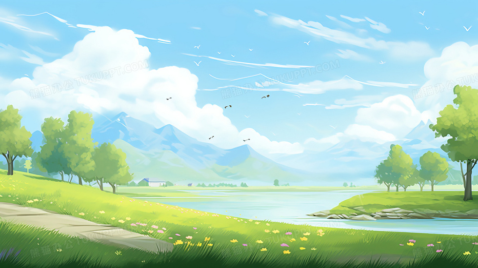 本作品内容为春天绿意盎然的草地树木风景插画, 格式为 jpg, 大小4 MB, 图片尺寸为2912 x 1632, 源文件无水印, 欢迎使用熊猫办公。 如认为平台内容涉嫌侵权,可通过邮件:tousu@tukuppt.com提出书面通知,我们将及时处理。