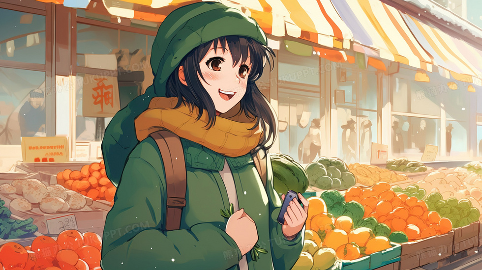本作品内容为冬天里在市场里买菜的女孩插画, 格式为 jpg, 大小3 MB, 图片尺寸为2912 x 1632, 源文件无水印, 欢迎使用熊猫办公。 如认为平台内容涉嫌侵权,可通过邮件:tousu@tukuppt.com提出书面通知,我们将及时处理。