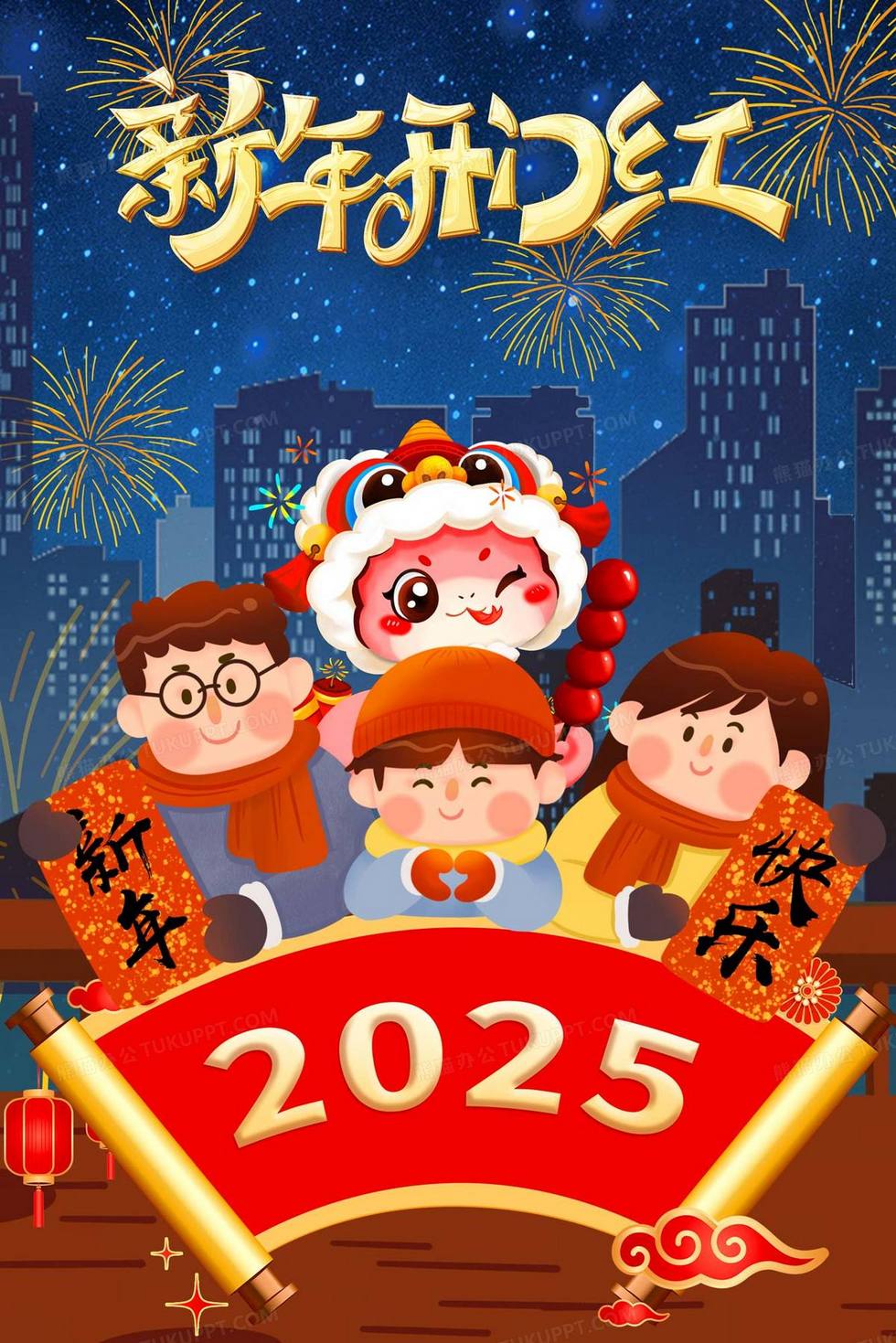 本作品内容为2025蛇年新年开门红全家拜年插画, 格式为 psd, 大小172 MB, 请使用软件PhotoShop(CC)打开, 源文件无水印, 欢迎使用熊猫办公。 如认为平台内容涉嫌侵权,可通过邮件:tousu@tukuppt.com提出书面通知,我们将及时处理。