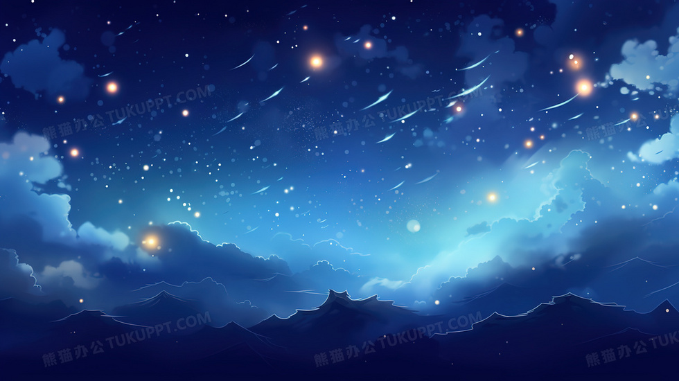 本作品内容为蓝色唯美夜色星空插画, 格式为 jpg, 大小5 MB, 图片尺寸为2912 x 1632, 源文件无水印, 欢迎使用熊猫办公。 如认为平台内容涉嫌侵权,可通过邮件:tousu@tukuppt.com提出书面通知,我们将及时处理。