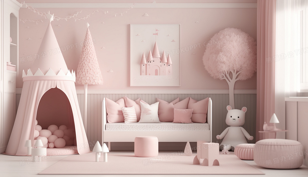 本作品内容为粉色温馨女孩公主风儿童房, 格式为 jpg, 大小5 MB, 图片尺寸为3328 x 1920, 源文件无水印, 欢迎使用熊猫办公。 如认为平台内容涉嫌侵权,可通过邮件:tousu@tukuppt.com提出书面通知,我们将及时处理。